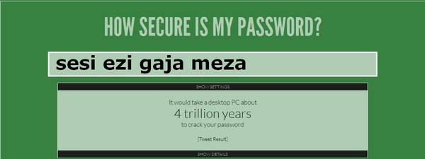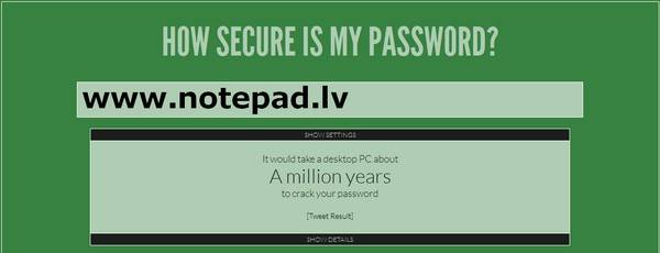 Apmeklējam lapu https://howsecureismypassword.net/ un pārbaudām savas paroles tanī. Tomēr atceramies, ka šeit analizē tikai mašīnas spēju pārmalt ciparus bez jebkādas loģikas. Aplikācija paroli "www.notepad.lv" uzskata par superdrošu, bet cilvēkam nebūt tā neliksies.