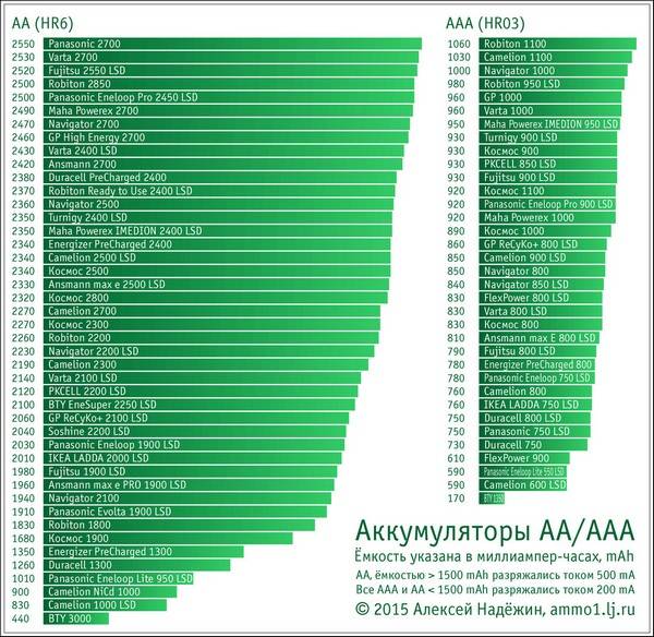* Pērkot populāru zīmolu AA akumulatorus ar deklarēto ietilpību no 950 mAh līdz 2450 mAh, to reālā ietilpība nav mazāka par 97%. AAA elementiem, uz kuriem rakstīts 550 līdz 1100 mAh - iekšās praktiski būs vismaz 94% enerģijas.