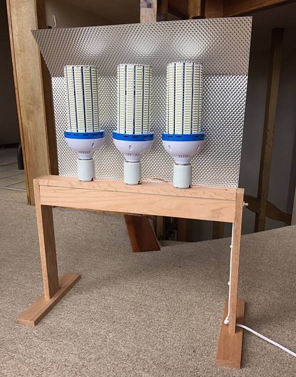 Bloga Meaningness autors Deivids Čepmens uzskata, ka arī ar to nepietiek, jo 10,000 lm noder tikai kā galdalampa, t.i. efektīvi darbojas tikai līdz 1 m attālumam. Visai istabai vajag 30,000 lm, un tāds gaismeklis arī tika konstruēts ar LED spuldžu pielietojumu. Amazon'ā tika sameklētas trīs 100 W LED "kukurūzas" spuldzes ar dienasgaismas (cold white) spektru. Katra no šīm spuldzēm ir 10,000 lm spoža. Konkrētās LED ir ar ilgu kalpošanas laiku; katra sekcija pieslēgta atsevišķi. Izejot no ierindas vienai sekcijai, spuldze turpina darboties. Draiveris - elektroniskais, korpuss - alumīnija, vienmērīgai dzesēšanai iebūvēts neliels 40-50 mm ventilators, kādu parasti lietoja vecajās videokartēs. Nedaudz lētāk šādas jaudas LED spuldzes sameklējamas Aliexpresā, bet zem 90-100 EUR nekas nav dabūjams.